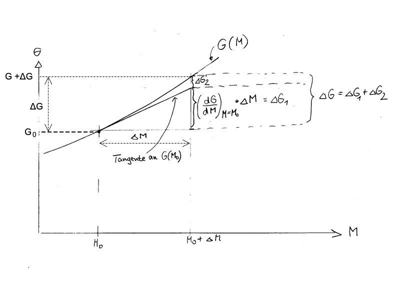 Wenn \(G\) eine Funktion von \(M\) ist und sich \(M\) von \(M_0\) auf (\(M_0 +\Delta M\)) ändert, dann ändert sich \(G\) von \(G_0\) (das ist der Wert von \(G\) an der Stelle \(M=M_0\) auf \(G_0 + \Delta G\). Der Zusammenhang lautet wie folgt: